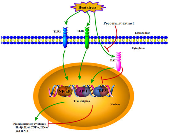 Figure 5. Schematic diagram of the possible molecular mechanism of peppermint extract’s regulation of innate immunity and inflammatory response in the spleen of broiler chickens under heat stress conditions. Chronic heat stress promoted the release of inflammatory cytokines by activating pattern recognition receptors TLR2, TLR4 and DAI, and their downstream signaling pathways of NF-κB, AP-1 and IRF3, which ultimately led to the activation of innate immunity and inflammatory response (green arrows). Moreover, peppermint extract reduced the release of inflammatory cytokines by down-regulating the expression of NF-κB and AP-1 mediated by DAI to inhibit the activation of innate immune and inflammatory responses in the spleen of broiler chickens caused by heat stress (red arrows).