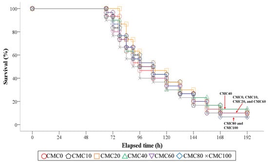 Data were subjected to one-way ANOVA and Tukey’s honestly significant difference test after normality (Shapiro–Wilk’s test) and homogeneity of variances (Levene’s test) using SPSS version 24.0 (SPSS Inc., Chicago, IL, USA). All values were presented as the mean ± standard deviation (SD) of the mean. Before statistical analysis, percentage data were arcsine-transformed. Statistical differences were regarded as significant with a p-value < 0.05. For statistically significant data, regression analysis was conducted to fit a suitable model. p-value was used for optimal regression selection to estimate an appropriate CMC inclusion level for the dependent variable. Survival of olive flounder was analyzed during the 8-day post-observation period after S. iniae infection by using the Kaplan–Meier survival curve, Log-Rank, and Wilcoxon tests.