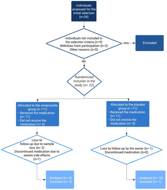 A randomized controlled clinical trial was conducted with two groups (control/study). Between July 2019 and July 2020, thirty-four dogs owned by employees and students of the university were prospectively examined to determine their inclusion in the study. Twenty-two dogs were examined for meeting the inclusion criteria, of which 18 dogs were analyzed. Inclusion in one of the two groups was randomized (Figure 1). The control group received a placebo (jelly capsules with 250 mg lactulose), and the study group received uncompounded omeprazole orally, with a median dose of 0.86 mg/kg (range: 0.53–1.0 mg/kg), administered through delayed-release capsules containing either 10 mg or 20 mg of omeprazole. Both groups followed a regimen of oral administration twice a day, 30 min before meals. For dogs in the study group, 10 mg omeprazole capsules were prescribed when the weight was between 7 kg and 15 kg, and 20 mg omeprazole capsules were prescribed when the weight was between 15 kg and 35 kg. All dogs were fed their regular food and had unlimited access to water.