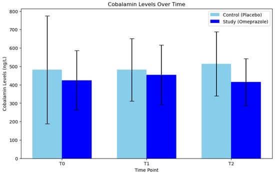 Comparison of serum cobalamin levels between the control group (placebo) and the study group (omeprazole), at times T0 (day 0), T1 (day 30), and T2 (day 60).