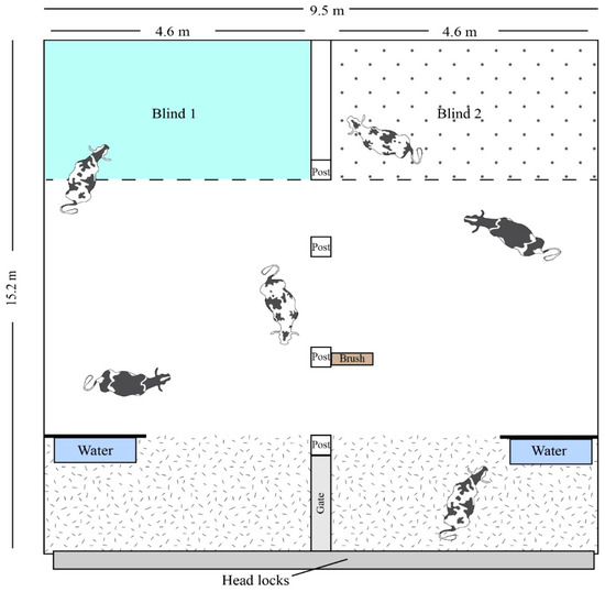 Behavior was continuously monitored using 6 digital video cameras (Swann HD Video Recorder, SWDVK-45804WL, Swann, Santa Fe Springs, CA, USA) and stored on hard drives (Western Digital WD Purple Surveillance Internal Hard Drive, Western Digital, San Jose, CA, USA) throughout the trial. One camera was mounted directly above each blind. Four cameras were mounted above and behind the feed alley pointed to look at the bedded pack treatment pen and feed alley. All areas of the pen were visible at all times. Individual cows were distinguished using their own markings that were identified on camera. All video observations were reviewed on the Swann HD Video Recorder that was used to record the videos, and data were recorded in Microsoft Excel (Microsoft Excel, version 16, Microsoft Cooperation, Redmond, WA, USA).
