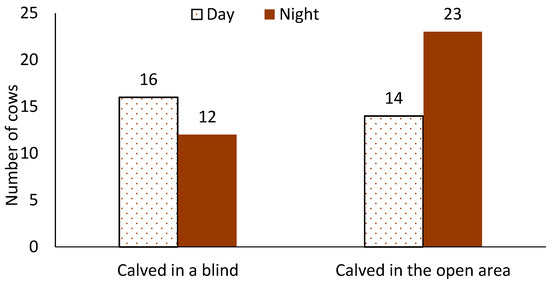 Number of cows who calved inside a blind (n = 28) or calved in the open area (n = 37) during the day (0600–1759) and at night (1800–0559).