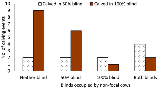 Relationship between blind occupancy by non-focal cows and blind use by focal cows during calving events (n = 28). The horizontal axis is labeled as neither blind (no cows present in either blind except the focal cow during calving), 50% blind (non-focal cow(s) present in the 50% blind during calving), 100% blind (non-focal cow(s) present in the 100% blind during calving), and both blinds (non-focal cow(s) present in both the 50% and 100% blinds during calving).
