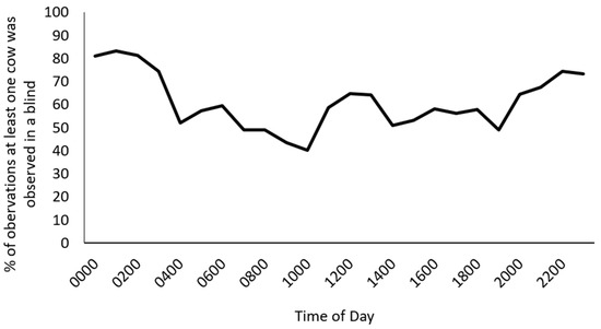 During video observations, it was observed that non-parturient cows commonly spent time in the blinds. We decided to include this descriptive information in the paper even though it was not one of the original objectives. The observations collected during focal cow baseline blind use were used to document non-parturient cow blind use. To calculate the non-parturient cow blind use, the number of observations of at least one cow present in a blind (50% or 100%) was summed within each hour of the day and divided by the total number of observations within that hour over a 24 h period, resulting in the average number of times a non-parturient cow was observed in a blind per hour from 0 to 2400 h.