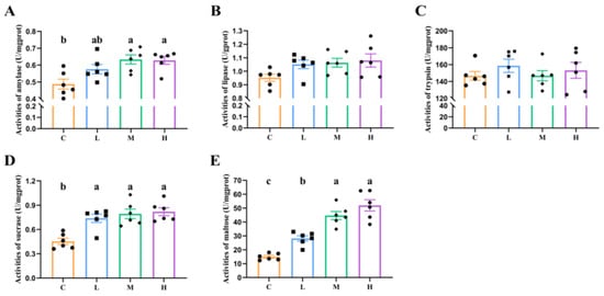 The activities of sucrose, maltase, and amylase were significantly increased in groups M and H (p < 0.05), as shown in Figure 1, compared with Group C. However, no significant differences were observed in the activities of lipase and trypsin among these groups (p > 0.05).