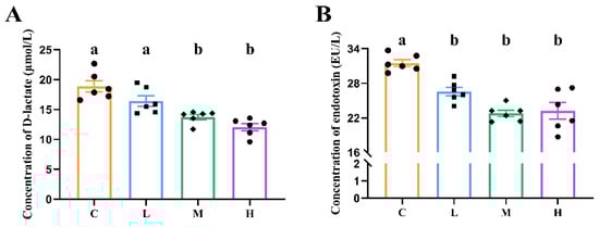Effects of feeding xylanase to broilers on intestinal permeability. (A) Concentration of D-lactate; (B) concentration of endotoxin. Each group contained six biological replicates, data are shown as mean ± SEM, and means denoted by letter a and b indicate significant differences between treatments (p < 0.05). Abbreviations: C (Group C, control group), L (Group L, 50 mg/kg of xylanase in feed), M (Group M, 100 mg/kg of xylanase in feed), and H (Group H, 150 mg/kg of xylanase in feed).