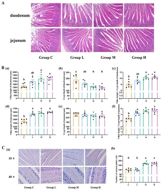Effects of feeding xylanase to broilers on intestinal health. (A) Light microscopy of cross-sections of the duodenum and jejunum (40×). (B) Morphological structure of duodenum villus epithelium, villus height (a), crypt depth (b), and villus height-to-crypt depth ratio (c). Morphological structure of jejunum villus epithelium, villus height (d), crypt depth (e), and villus height-to-crypt depth ratio (f). (C) Light microscopy of cross-sections of the jejunum goblet cell (a) and the number of goblet cells in the jejunum mucosa (b). Each group contained six biological replicates, data are shown as mean ± SEM, and means denoted by letter a and b indicate significant differences between treatments (p < 0.05). Abbreviations: C (Group C, control group), L (Group L, 50 mg/kg of xylanase in feed), M (Group M, 100 mg/kg of xylanase in feed), and H (Group H, 150 mg/kg of xylanase in feed).