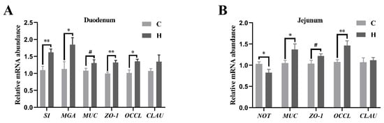Effects of feeding xylanase to broilers on relative mRNA abundance in the gut. (A) Changes in relative mRNA abundance in the duodenum; (B) changes in relative mRNA abundance in the jejunum. The t-test was employed for post hoc comparisons. Each group contained six biological replicates, data were shown as mean ± SEM, and means denoted by different symbols indicate significant differences between treatments (p < 0.05); #: 0.05 < p < 0.1, *: p < 0.05, and **: p < 0.01. Abbreviations: SI, sucrase–isomaltase; MGA, Maltase Glucoamylase; NOT, Notch; MUC, mucin; OCCL, Occludin; CLAU, Claudin; C (Group C, control group), and H (Group H, 150 mg/kg of xylanase in feed).