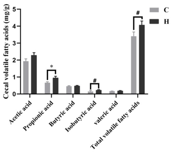 Effects of feeding xylanase to broilers on short-chain fatty acids. The t-test was employed for post hoc comparisons. Each group contained six biological replicates, and data are shown as mean ± SEM. Abbreviations: C (Group C, control group) and H (Group H, 150 mg/kg of xylanase in feed); #: 0.05 < p < 0.1, and *: p < 0.05.