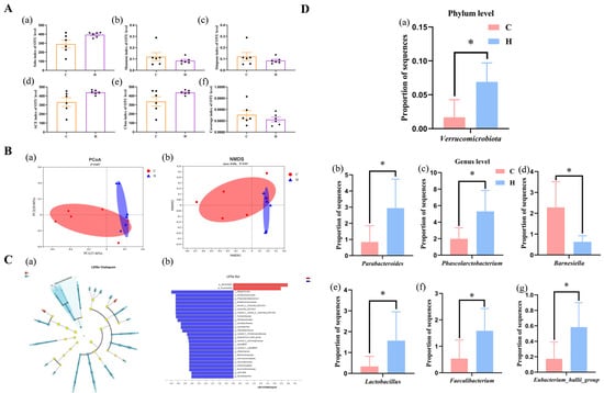 Effects of feeding xylanase to broilers on the composition of the gut microbiota. (A) α-diversity of the (a) Sobs, (b) Shannon, (c) Simpson, (d) ACE, (e) Chao and (f) Coverage index of OUT level; (B) β-diversity assessed by PcoA (a) and NMDS (b) analysis; (C) LEfSe analysis (LDA > 2.5) of Cladogram (a) and Bar (b); (D) column diagram of the relative abundance of Verrucomicrobita at the Phylum level (a) and the relative abundances of Parabacteroides (b), Phascolarctobacterium (c), Barnesiella (d), Lactobacillus (e), Faeculibacterium (f), and Eubacterium_hallii_group (g) at the genus level. Each plot represents one sample (n = 6). Abbreviations: C (Group C, control group) and H (Group H, 150 mg/kg of xylanase in feed). *: p < 0.05.