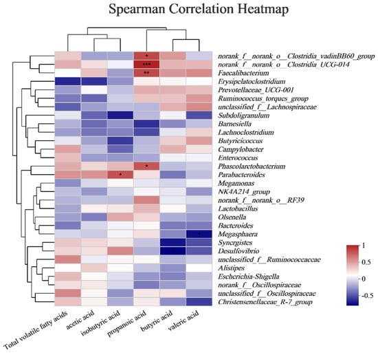 Correlation analysis of bacterial flora and volatile fatty acids. Each group contained six biological replicates. Abbreviations: *: 0.01 < p < 0.05, **: 0.001 < p < 0.01, and ***: p < 0.001.