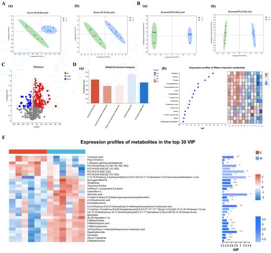 In line with the method described by Zhu et al. [], the metabolic changes between groups were analyzed using Partial Least Squares Discriminant Analysis (PLS-DA) and Orthogonal Partial Least Squares Discriminant Analysis (OPLS-DA). Within the OPLS-DA model, the Variable Importance in the Projection (VIP) was calculated to identify the most influential metabolites contributing to the group differences. Furthermore, enrichment analysis of pathways associated with the identified metabolites was performed based on the Kyoto Encyclopedia of Genes and Genomes (KEGG).
