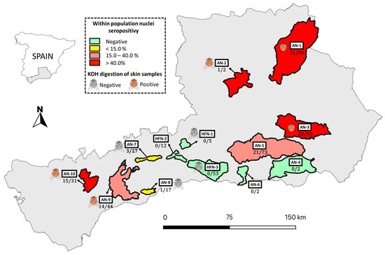 At least one seropositive Iberian ibex was detected in 8 of the 13 (61.5%) population nuclei, with seropositive values ranging between 5.8% and 50%. Seropositive animals were detected in AN but not in HFN (Figure 1). Anti-S. scabiei antibodies were not detected in any of the 392 domestic goats. Sarcoptic mange-compatible lesions were not observed by farmers in the 28 goat flocks sampled.