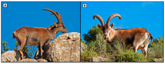 The Iberian ibex, or Iberian wild goat (Capra pyrenaica), is a distinctive endemic medium-sized wild ruminant emblematic of the Iberian Peninsula. Traditionally, four different subspecies of Iberian ibex have been described: C. pyrenaica lusitanica, which formerly inhabited northern Portugal and certain regions of northwestern Spain; C. p. pyrenaica, in the Pyrenees Mountains; C. p. hispanica, found in the southern and eastern regions of the Iberian Peninsula; and C. p. victoriae, distributed mainly in central areas of Spain [9]. At present, only two of the four subspecies originally described are not extinct (C. p. hispanica and C. p. victoriae) with a population of around 100,000 individuals that is expanding, or at least stable, in southern, central, and eastern regions of Spain, with smaller, localized populations also found in northern Portugal and southern France [10].
