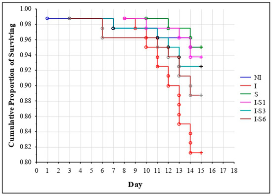 Survival of bees in the group treated with supplement (S), non-infected control (NI), N. ceranae-infected control (I), and groups infected and treated with the supplement from day 1 (I-S1), day 3 (I-S3), and day 6 (I-S6). Group names are presented in Table 1.