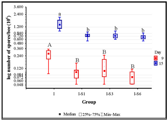 Nosema spore loads in infected control (I) and groups infected and treated with the supplement from day 1 (I-S1), day 3 (I-S3), and day 6 (I-S6). Different letters denote significant differences between the groups. Group names are presented in Table 1.
