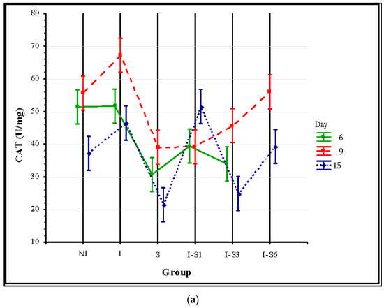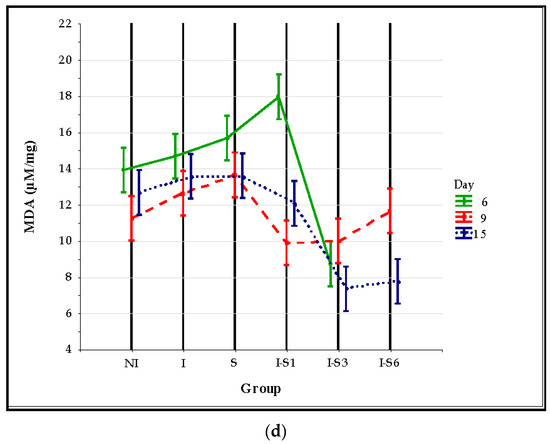 Mean values for (a) catalase—CAT, (b) superoxide dismutase—SOD and (c) glutathione S-transferase—GST activities and (d) malondialdehyde—MDA concentration. Group treated with supplement (S), non-infected control (NI), N. ceranae-infected control (I), and groups infected and treated with the supplement from day 1 (I-S1), day 3 (I-S3), and day 6 (I-S6). Group names are presented in Table 1.