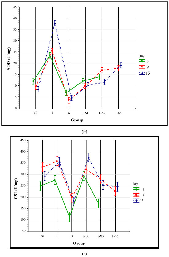 The results of the discriminant analysis showed that on days 6, 9, and 15, the differences between all analyzed groups, as well as between the pairs of the two groups, were statistically significant (p < 0.05) when all four parameters of oxidative stress were observed simultaneously. At the time of bee sampling (days 6, 9, and 15), ANOVA revealed significant differences (p < 0.001) in enzyme activity (SOD, CAS, and GST) and MDA concentration among all the groups. The most significant differences were identified on day 15. According to the Tukey’s test on day 15, SOD enzyme activity was not significantly different only in group I-S1 compared to NI (p = 0.487) and I-S3 (p = 0.579). Catalase (CAT) activity was significantly lower (p < 0.05) in group S compared to all the other groups except I-S3. Moreover, it was significantly higher in group I-S1 compared to groups NI and I-S3, and it was significantly lower in group I-S3 compared to I and I-S6. (Figure 3). By analyzing the activity of the GST enzyme, significantly higher (p < 0.001) values were found in groups I and I-S1 compared to the other experimental groups, while there were no significant differences only between groups I-S3 and I-S6 (p = 0.535). The concentration of MDA was not different when compared between groups I-S3 and I-S6 (p = 0.998) but was significantly lower (p < 0.001) in each of them when compared to all other experimental groups (Figure 3).