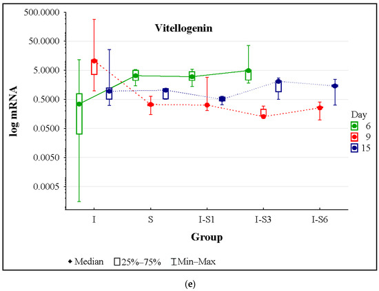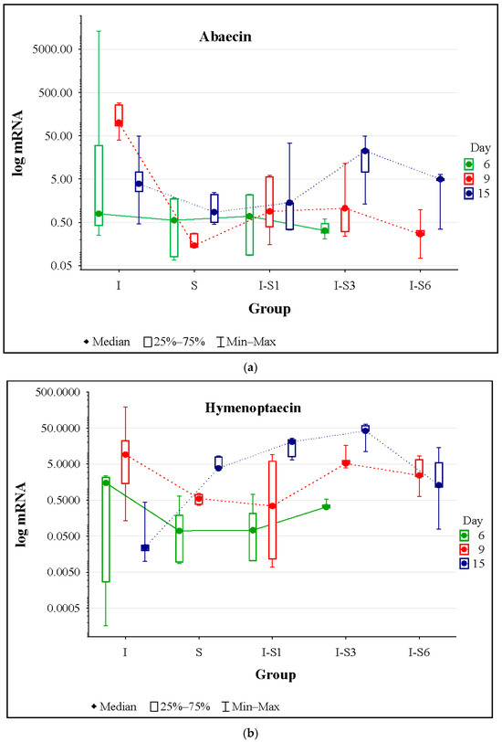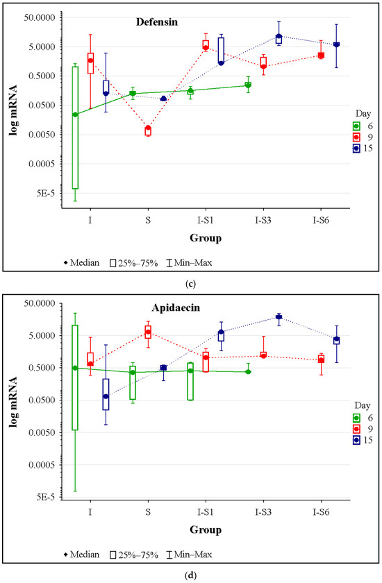 According to the Kruskal–Wallis test, on day 6, there were no significant differences (p > 0.05) in expression levels of all monitored genes (Figure 4 and Supplementary Figure S1). Levels of gene expression in bees collected on day 9 were significantly different (p < 0.05) and without a clear pattern, except expression levels for hymenoptaecin (p = 0.0877). However, it is interesting that in group S, which received the supplement without infection, levels of gene expression for abaecin and defensin were lower than in other groups, even lower than in the infected control (I) group (Figure 4 and Supplementary Figure S1). According to the experimental design and dynamics of Nosema infection, the most important gene expression results were those recorded on day 15 (Figure 4 and Supplementary Figure S1). According to Mann–Whitney U Test, on that day, levels of hymenoptaecin gene transcripts were lowest in group I (Figure 4 and Supplementary Figure S1) and significantly lower than in all other groups (p < 0.05). However, vitellogenin gene transcript levels were highest in group I. When it comes to the expression levels of defensin and apidaecin genes, values in groups I and S were significantly lower (p < 0.05) than in other groups.