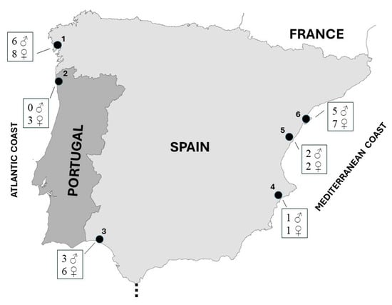 Samples were collected from six breeding locations situated along the Iberian coast. Among these, three sites are positioned along the Mediterranean coast, while the remaining three are located on the Atlantic coast, with one in southern Spain and two in northern Portugal and northwestern Spain (Figure 1).