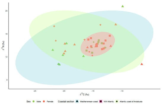 The LMMs showed that neither δ13C nor δ15N concentrations were significantly affected by sex or coastal section (Table 1).
