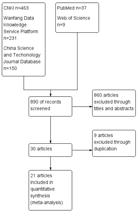 According to the retrieval strategy applied to various databases, a total of 890 relevant articles were identified. Following the literature screening process outlined in the Cochrane manual, which involves assessing titles, abstracts, content, and exclusion criteria, the final selection included 21 articles [27,39,40,41,42,43,44,45,46,47,48,49,50,51,52,53,54,55,56,57,58]. These comprised 17 Chinese-language articles and 4 English-language articles for conducting a meta-analysis on the prevalence of FIP in mainland China, with a total sample size of 181,014 cases. All 21 studies were ultimately included in our meta-analysis. The following data were extracted: the first author, publication year of the journal, survey area, no. positive, no. examined, and detection method (Table 1). Figure 1 provides a detailed overview of the selection process and results.