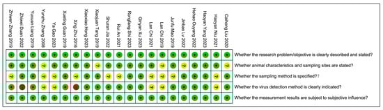 Randomized controlled trials (RCTs) are widely considered the gold standard for establishing causal associations in clinical research. Although this non-randomized controlled study (a cross-sectional study) differs from a randomized clinical trial, its well-designed systematic evaluation method can provide valuable evidence for evidence-based medicine. Utilizing the Cochrane quality assessment tool, combined with an enhanced critical appraisal tool (High-Quality Item Rating Scale) developed by Munn et al. [31], we adapted the methodology for systematic evaluation in this study and assessed the risk of bias for the included studies [31]. Data extraction and recording were independently performed by three trained researchers. We then extracted the following information from each of the included studies: first author, sampling time, sampling location, total number of cats, numbers of FIP-positive cats, study design, age and sex of the animals, and detection method. Microsoft Excel 2017 was used for data management. RevMan 5.3 was used for quality assessment in terms of bias [32]. The following six items were examined and given a score based on a simple scale: 2 for “yes”, 1 for “unsure”, or 0 for “no”. (1) Were the research objectives/problems clearly described and stated? (2) Were the characteristics and location of the experimental animals clarified? (3) Was the sampling method described in detail? (4) Were the virus detection methods clearly noted? (5) Were the survey results subjectively influenced? Studies with a total quality evaluation score ≤ 6 were not included in the statistical analysis.