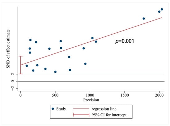 Egger test of publication bias among FIP studies. SND: Standard normal deviation; Precision: Inverse of the variance.