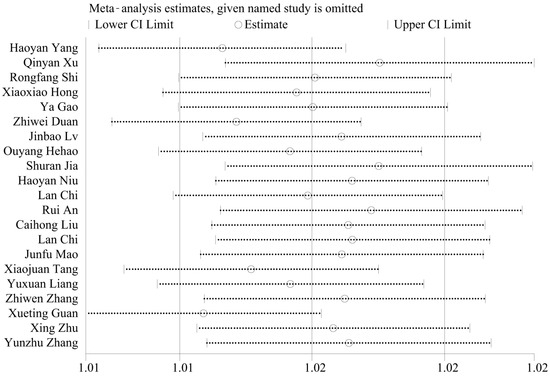 Applying Egger’s test to analyze potential publication bias yielded a result of p = 0.001 < 0.05, indicating a relatively high risk of publication bias, as shown in Figure 4. Given the substantial heterogeneity observed in the meta-analysis of FIP incidence rates, a sensitivity analysis was performed on the included literature. Through the systematic removal of individual studies for sensitivity analysis [59], the results indicated that the effect sizes consistently fell within the 95% confidence interval of the final effect size. This demonstrates the good stability and robustness of the results, as depicted in Figure 5.