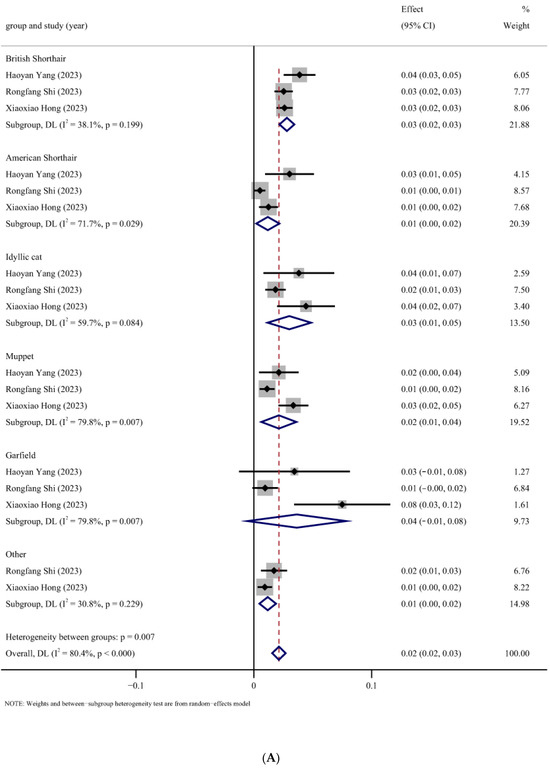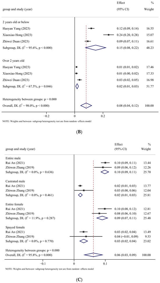 Forest plot of the FIP estimated incidence subgroup with random-effects analyses. (A) The subgroup analysis of different breeds [43,50,54]; (B) the subgroup analysis of different ages [41,43,54]; (C) the subgroup analysis by gender [38,56]; and (D) the subgroup analysis by season [38,50,52,56]. ES: Effect size (positive proportion).