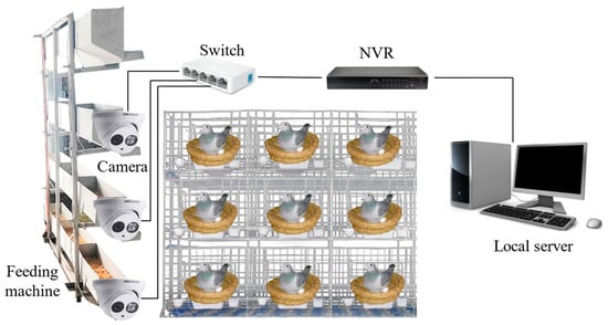 From 1 April 2022 to 15 May 2022, video data of pigeon eggs from 150 pairs of breeding pigeons were collected daily. The Silver King pigeon breed was selected as the focus of the study. Custom brackets with Hikvision T12HV3-IA/PoE cameras from Hikvision, Hangzhou, China, were mounted on feeding machines in each row of pigeon coops to capture side-view videos of egg-laying activities. The collected videos were in RGB format. The speed of the cameras was approximately 1 m/min, synchronized with the speed of the feeding machines. Each pigeon coop had a width of 50 cm. Data collection was conducted for 30 min for every batch of 50 pairs of breeding pigeons. A total of 2832 original images were obtained by extracting frames from the collected videos. An illustration of the data collection setup is shown in Figure 1.