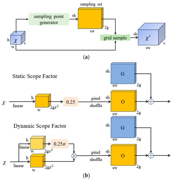 Dysample network structure: (a) Sampling based dynamic upsampling; (b) Sampling point generator in DySample. The input feature, upsample feature, generated offset, and original grid are denoted by , , and , respectively. denotes the sigmoid function. represents the sampled height, represents the sampled width. represents the number of channels after the feature graph passes through the linear layer.