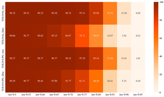 Figure 11 illustrates the detection effects of YOLOv8n and YOLOv8-PG models on real and fake pigeon eggs under different IoU thresholds—that is, AP values of each category, presented in the form of heat maps. With the increase in IoU, the AP value of each category decreased gradually. When the IoU threshold is lower than 0.8, the AP value of both models is higher than 85% for the real pigeon egg target. The results show that the two models can detect the real pigeon eggs well. For fake pigeon eggs, when the IoU is 0.7 to 0.8, the pigeon eggs are sticky and occluding seriously, and the YOLOv8n model cannot be effectively detected, while the YOLOv8-PG model can reduce the interference of the complex environment and the detection accuracy is increased by 2.3%, 9%, and 9.42%, respectively.