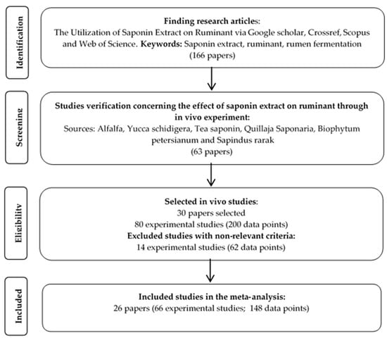 The present study database was constructed from various studies which reported the nutritional utilization of saponins in extracted form. The data included in the constructed database were based on published articles written in English describing in vivo experiments. All included in vivo data were obtained from journals indexed in Google scholar, Crossref, Scopus and Web of Science such as graphically described in Figure 1.
