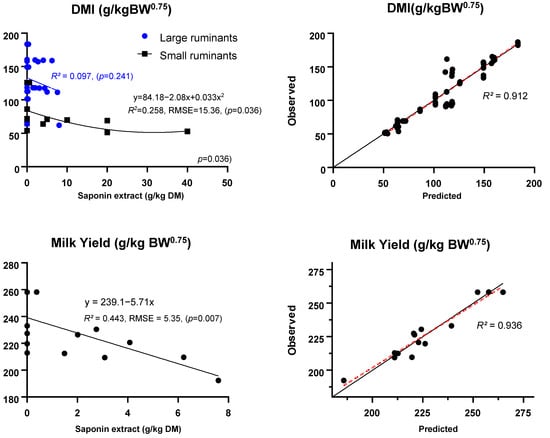 Meta-regression results representing the relationships between dietary saponin sources’ intake (g/kg DM) on dry matter intake and milk yield per metabolic body weight (BW0.75). The right figures represent the model performance evaluation according to the observed vs. predicted values.