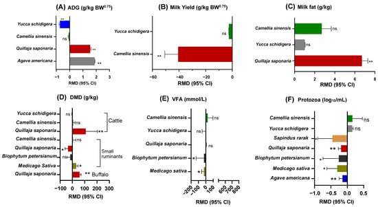 Supplementation with saponin extract has been associated with modifications in multiple performance parameters in ruminants, including feed intake, daily weight gain, milk yield, and milk nutrient composition. It has been observed that large and small ruminants exhibit distinct effects on milk yield and nutrient composition, particularly when supplemented with saponins [42,44]. Although the digestibility rates, ruminal fermentation effectivity, N utilization, and blood parameters between large and small ruminants also displayed intricacy, the present meta-analysis provides robust evidence regarding the effects of dietary saponin extracts on ruminant production, such as ADG and Milk yield, relative to ruminant metabolic weights (Figure 2). Moreover, a comparative analysis of different saponin extracts can elucidate the varying effects of each extract on the observed parameters in ruminants.