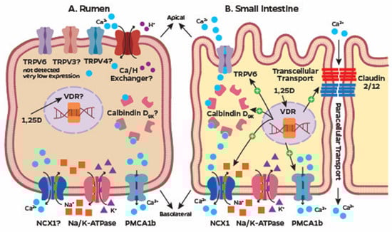 Regulation of Ca homeostasis by 1,25-dihydroxyvitamin D3 requires the latter to bind to VDR. Once 1,25-dihydroxyvitamin D3 binds to the VDR, the VDR forms a heterodimer with the retinoid-X receptor (RXR). The complex VDR-RXR heterodimer recognizes vitamin D-responsive elements, which are specific DNA sequences []. Localization of the VDR-RXR complex to accessible vitamin D-responsive elements in the genome facilitates induction or repression of transcription as a result of the recruitment of co-activators and co-repressors. When 1,25-dihydroxyvitamin D3 binds to VDR, there is disruption of co-repressors that are bound to the VDR, which are replaced by co-activators, resulting in local chromatin relaxation and gene activation []. In monogastrics, 1,25-dihydroxyvitamin D3 regulates gastrointestinal absorption of Ca mostly in the duodenum [] by enhancing the expression of the apical membrane transporter, TRPV6 [], and the basolateral transporters, PMCA and NCX1 [,]. Likewise, calbindin-D9k encoded by the gene S100G had mRNA expression reduced in the intestines of mice lacking VDR []. In ruminants, expression of genes for VDR, S100G, and ATP2B1 (gene encoding PMCA1) has been reported in the duodenum of dairy cows []. On the other hand, transcriptomic data from RNA sequencing or PCR from six published studies, four using bovine [,,,] and two using ovine [,] rumen tissue showed either absent or marginal abundance of mRNA for TRPV5, TRPV6, S100G, SLC81A (gene encoding NCX1), ATP2B1, suggesting that the classic mechanisms for Ca absorption and transport across the rumen epithelium are either absent or in limited abundance (Figure 1A). Schröder and Breves [] showed that the site of absorption of Ca in the bovine gastrointestinal tract is dependent on the amount of Ca consumed. In vitro experiments with Ussing chambers clearly demonstrated the presence of the transcellular transport of Ca2+ in the bovine ruminal epithelia in the absence of TRPV6 expression []. Either distinct Ca channels and transport mechanisms exist in bovine rumen epithelia to actively absorb Ca, or the mechanisms are dependent on paracellular transport and the proteins involved, and their importance likely differs from those characterized in the small intestine (Figure 1B). Recently, TRPV3 has been shown to be expressed in the bovine rumen epithelium with a potential role in the transport of cations, including Ca2+ []. Thus, the regulatory effects of 1,25-dihydroxyvitamin D3 and the cellular mechanism of ruminal transcellular Ca2+ transport remain undefined but are important to uptake and transport Ca across the epithelia (Figure 1A).