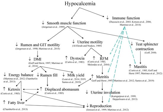 Diagram depicting the associations among diseases in which hypocalcemia has been shown to play a central role either through epidemiological studies or mechanistic experiments. References are included [,,,,,,,,,,,,,,,,,,]. Continuous lines depict links among diseases. Dashed blue lines depict proposed mechanisms linking immune function and some diseases. Arrows before each disease indicate if hypocalcemia is associated with an increase (arrow up) or decrease/delay (arrow down) in the particular response. DMI = dry matter intake; GIT = gastrointestinal tract; RFM = retained fetal membranes.