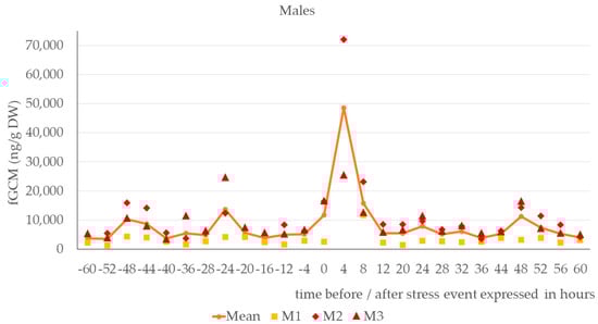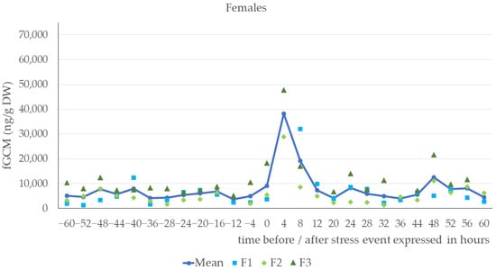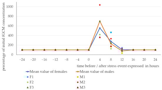 As demonstrated in Figure 1 and Figure 2, females and males showed a distinct increase in fGCMs during the first four hours after the stress event. From a baseline of 6866 ng/g dry weight (DW) in the females and 6920 ng/g DW in the males, the mean glucocorticoid metabolite concentration increased to 38,219 ng/g DW in females and 48,586 ng/g DW in males during the first few hours after the stress event (for details, see Table A1). The overall baseline using all animals was 6893 ng/g DW and the corresponding mean concentration during the first four hours after the stress event was 43,402 ng/g DW (increase to 629% in relation to the baseline). Expressed as the mean value of the percentage variation of the initial fGCM concentration, this indicated an increase to 557% in females and 702% in males (see Figure 3). As little as 8 h after the start of the stress event, the fGCM concentration dropped to an average of 279% (females) and 227% (males) and reverted to the basal level by, at the latest, 16 h after the start or 14 h after the end of the stress event.