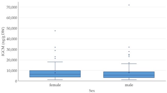 No statistically significant differences could be found between the sexes (p = 0.903), as seen in Figure 4. For both sexes, the baseline values were around 7000 ng/g DW (6866 females, 6920 males) and both sexes also reacted with a similar increase (5.5 to 7-fold) during the stress event.