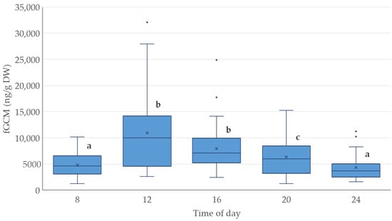 Diurnal variation in fecal glucocorticoid metabolite (fGCM) levels in ng/g dry weight (DW). Significant differences between times of day are indicated by different letters.