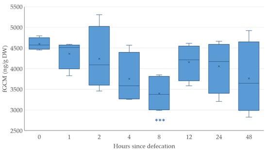 The data showed a drop in fGCM concentration in the first 8 h after defecation by a total of 26%, in the following 4 h again approaching the original value (91%), thereafter once again dropping to 75% between hours 12 to 48. The difference between 8 h versus 0 h was highly significant (p ≤ 0.001), as seen in Figure 6.
