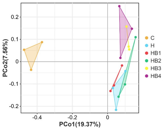 The β-diversity is shown in Figure 2, and by analyzing the flora structure, group C can be observed to be spatially separated from the other groupings, and the Kru–Wall test shows that the difference is significant (p = 0.03). Although there is some distance in the space between the H-HB4 groups, the difference is not significant (p = 0.10). Compared with the C group, the high-carbohydrate diet significantly changed the spatial structure of the hindgut flora of tilapia, but berberine supplementation had no significant effect on the flora structure.