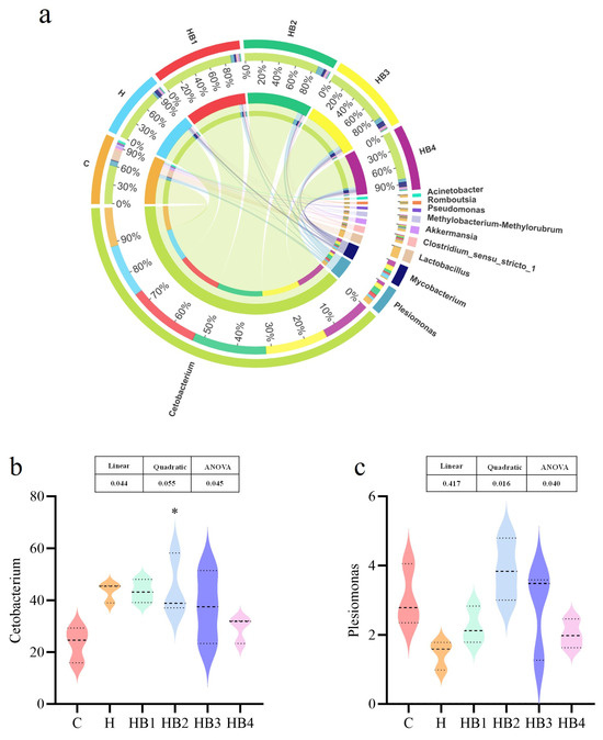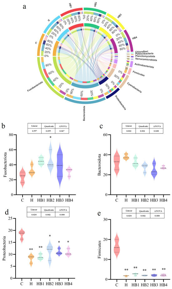 The analysis of species composition is shown in Figure 3 and Figure 4. At the phylum, the predominant bacteria in the hindgut of tilapia included Fusobacteria, Bacteroides, Proteobacteria, Cyanobacteria, Firmicutes. The composition of the predominant bacteria was similar among the groups, but their abundance has varied. Compared with group C, the abundance of Fusobacteria in group H increased, and with the increase in berberine supplementation, the abundance of Fusobacteria first increased and then decreased, with a maximum abundance in the HB2 group (p < 0.05). Compared with group C, the Bacteroides in group H increased, and berberine supplementation decreased their abundance; the lowest abundance was in group HB3. Compared with group C, the abundance of Proteobacteria was significantly decreased (p < 0.01), and berberine supplementation increased their abundance; the HB3 group had the highest abundance of Proteobacteria, but the abundance of Proteobacteria was still significantly lower than that in group C (p < 0.05). The abundance of Firmicutes in the H-HB4 group was significantly lower than that in the C group (p < 0.05), and there was no significant difference among the H groups. At the genus level, the dominant bacteria were Cetobacterium and Plesiomonas, and the abundance of Cetobacterium in group H was higher than that in group C. With the increase in berberine addition, the Cetobacterium abundance decreased, and the abundance of HB2 was the highest. Compared with group C, the abundance of Plesiomonas decreased in group H. Its abundance first increased and then decreased with the increase in berberine content, and the highest abundance was found in group HB2.