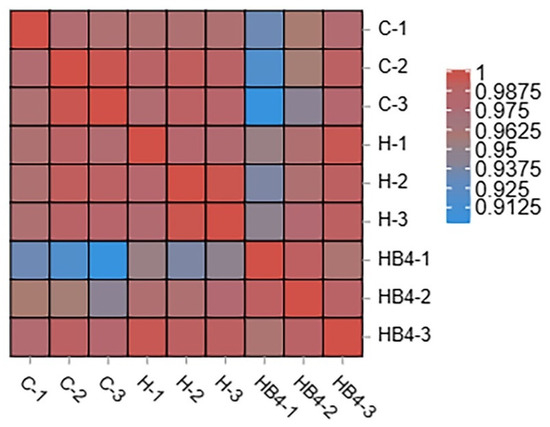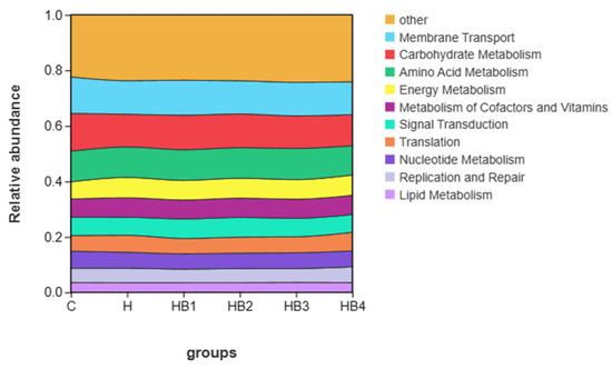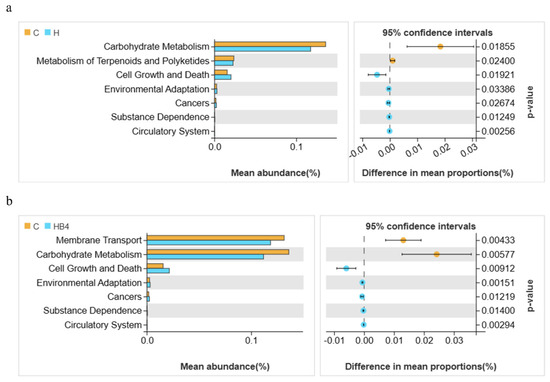 The functional prediction of each group was performed using Tax4fun analysis, and the results are shown in Figure 5. The top 10 functional groups include Membrane Transport, Carbohydrate Metabolism, Amino Acid Metabolism, Energy Metabolism, Metabolism of Cofactors and Vitamins, Signal Transduction, Translation, Nucleotide Metabolism, Replication and Repair, and Lipid Metabolism. At KEGG level 2 (p < 0.05), Welch’s t-test showed a significant decrease in Carbohydrate Metabolism and Metabolism of Terpenoids and Polyketides, as well as a significant increase in Cell Growth and Death in group H compared to group C (Figure 6a). Membrane Transport and Carbohydrate Metabolism were significantly reduced, and Cell Growth and Death were significantly increased in the HB4 group compared to the C group (Figure 6b). Compared with group H, there was no significant enrichment pathway in group HB4.