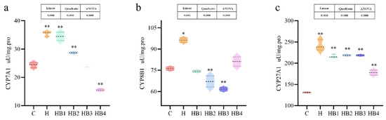 As shown in Figure 7, hepatic bile acid synthase was affected by the high-carbohydrate diet, and the enzyme activities of CYP27A1, CYP8B1 and CYP7A1 were significantly increased in group H compared to group C (p < 0.05). All three were also affected by the berberine content, with CYP27A1, CYP8B1 and CYP7A1 decreasing with increasing berberine supplementation.