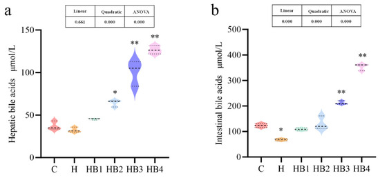 Effects of berberine supplementation in high-carbohydrate diets on liver and intestinal bile acid content in tilapia. (a) Hepatic bile acids; (b) Intestinal bile acids. One-way ANOVA and Dunnett’s test analyses (* p < 0.05 and ** p < 0.01). The three lines in the box plot are the upper quartile, the median and the lower quartile from top to bottom.