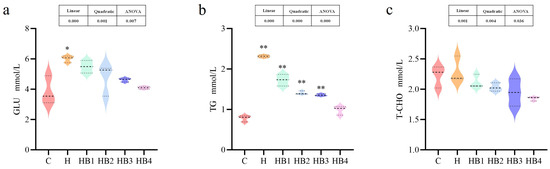 Effect of berberine supplementation in high-carbohydrate diets on serum biochemical indexes of tilapia. (a) GLU, glucose; (b) TG, triglyceride; (c) T-CHO, total cholesterol; One-way ANOVA and Dunnett’s test analyses (* p < 0.05 and ** p < 0.01). The three lines in the box plot are the upper quartile, the median and the lower quartile from top to bottom.