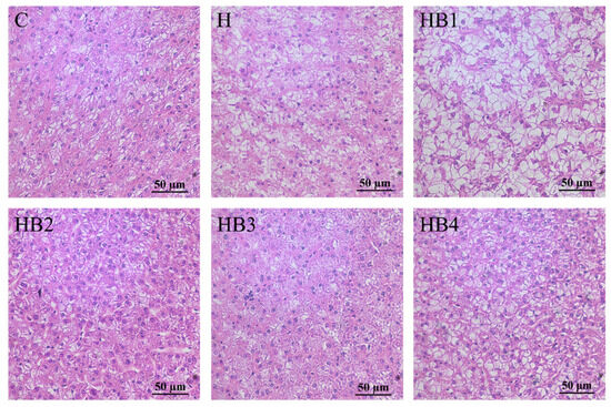 As can be seen from Table 3, there was no significant difference in the SR between the groups, which were all above 90%. Compared with group C, the WGR and SGR decreased in group H and improved with the increase in berberine supplementation, with no significant difference between groups. Compared with group C, the FCR increased in group H and decreased with berberine; however, there was no significant difference in the FCR between groups. The HSI of group H increased, compared with that in group C, and the VSI increased at a berberine supplementation of 25 mg/kg and decreased after a further increase in berberine supplementation; meanwhile, the HB4 group had the lowest HSI. There was no significant difference among the groups for the VSI and CF. The above results indicate that berberine supplementation in high-carbohydrate diets increases the WGR and SGR, and decreases the FC and HSI of tilapia.