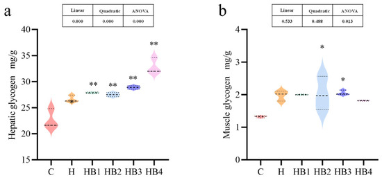 As shown in Figure 11, an increasing carbohydrate content in the diet caused the accumulation of hepatic glycogen (p < 0.05) and muscle glycogen in tilapia; the hepatic glycogen contents further increased with increasing berberine content (p < 0.05), with the highest hepatic glycogen content in the HB4 group.